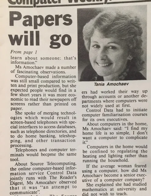 It takes some research to figure out that the newspaper and conference are both in Australia. The date is just weeks after my wedding in September of 1982. Some 35 years ago "Ms Amochaev spoke of merging technologies which would result in screen-based telephones with special interfaces to access databases, such as telephone directories, and do home banking, teleshopping and other transaction processing. Telephones and computer terminals would become the same tool."
