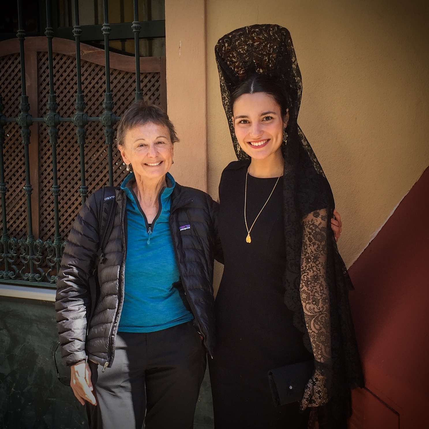 We switched back to their language, and I learned that starting Thursday afternoon, this was how most of the women of Seville would be dressing until Easter, as my taxi drive to the airport was to confirm. I touched her arms, unable to decide if it was tattoos or lace, then asked if I could take her picture. As she posed, the taxi driver came around and insisted we should both be in it.