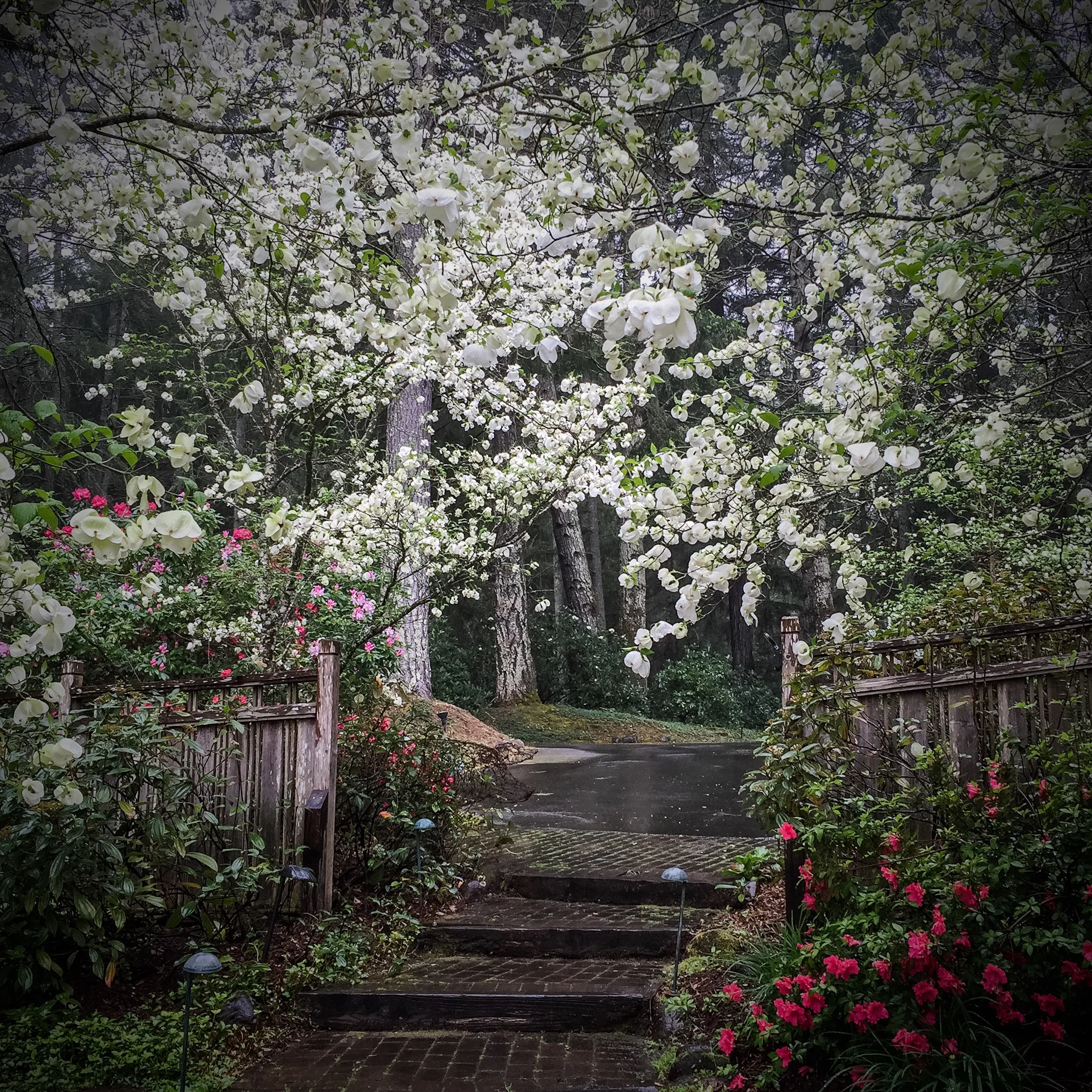 The timing coincided with the blooming of the dogwood and rhododendron forest up in Healdsburg. Where the steps lead through the dogwood trees we once parked cars on an ugly driveway. When I look at it all through the living room windows I am standing in what was once the garage. Now the cars park outside out of sight and I bask in the beauty.