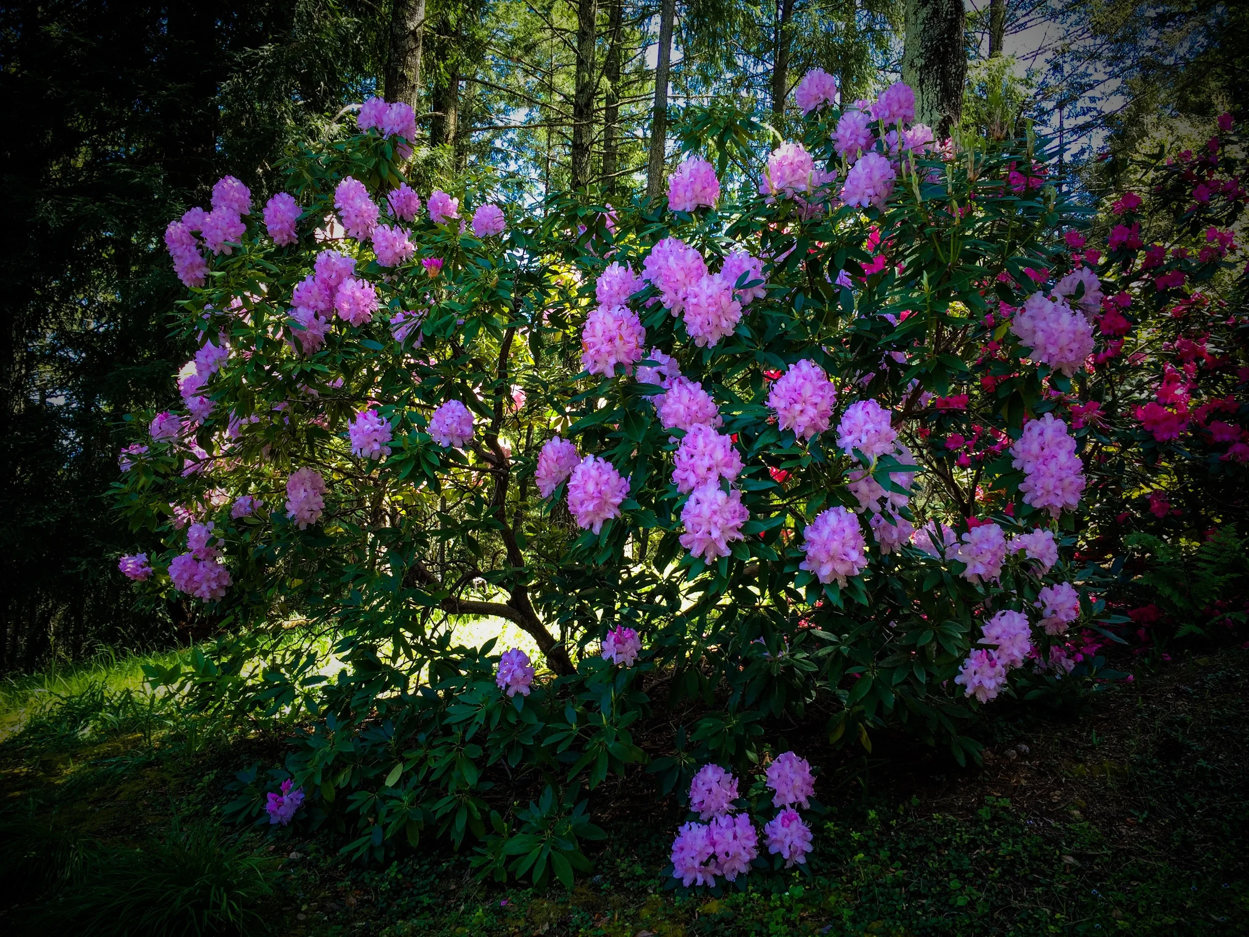 Almost 30 years ago our friend Mary Lou came to visit from Paris. We had brought some small neglected "as-is" rhododendron from a nursery to plant in the redwood forest. I can still see her taking turns swinging the pick-ax at the rock hard Sonoma clay. It took three days and gentle soaking overnight to dig ten holes deep enough to shelter the roots. We had read that fir needles form the kind of acid-base those plants love, so the giant holes were then filled with that same clay mixed with needles and duff. We lovingly spread the roots, making sure they had room to breathe and spread. Those ugly ducklings are now 20 feet tall and happy as pigs in, well, you know.