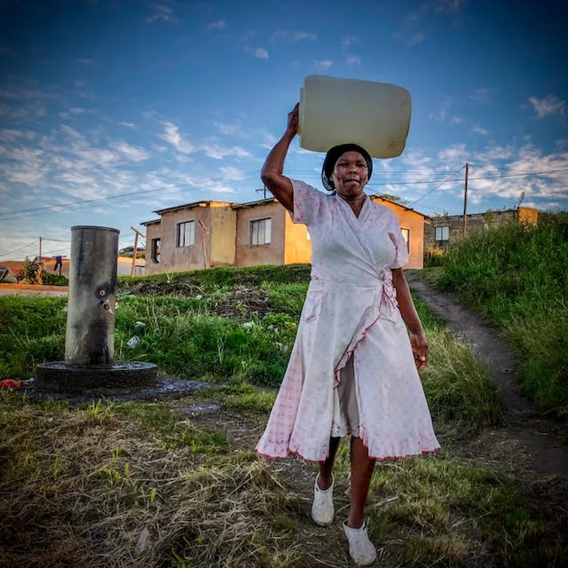 On my way home, passing the water spigot, I met Daphne, a 54-year-old, just as effortlessly flipping about 50 pounds of water onto her head as young Thandeka had. I couldn’t resist another conversation, and then wanted to give her a light as well. I had to follow her home to do that as she was quickly on her way.