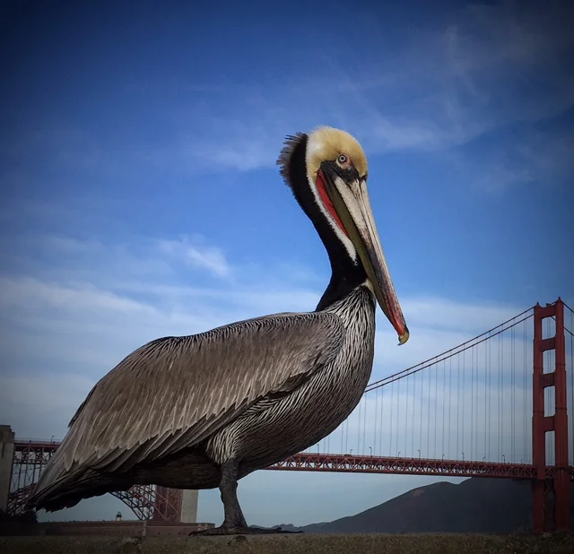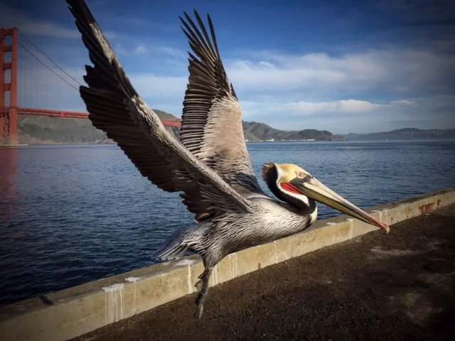 A pelican waited for us on the fishing dock as we approached the warming hut. It sat patiently as we posed with it, as if it had been paid for the session. Overhead, the California Brown Pelican seems like just a large brown bird. Up close he had a red chin, pale gold head, eyes inset in pink diamonds, and his gently striated beak ended with a small yellow hook. We worried that he might be injured, but the fisherman assured us he had shown up just before we did.