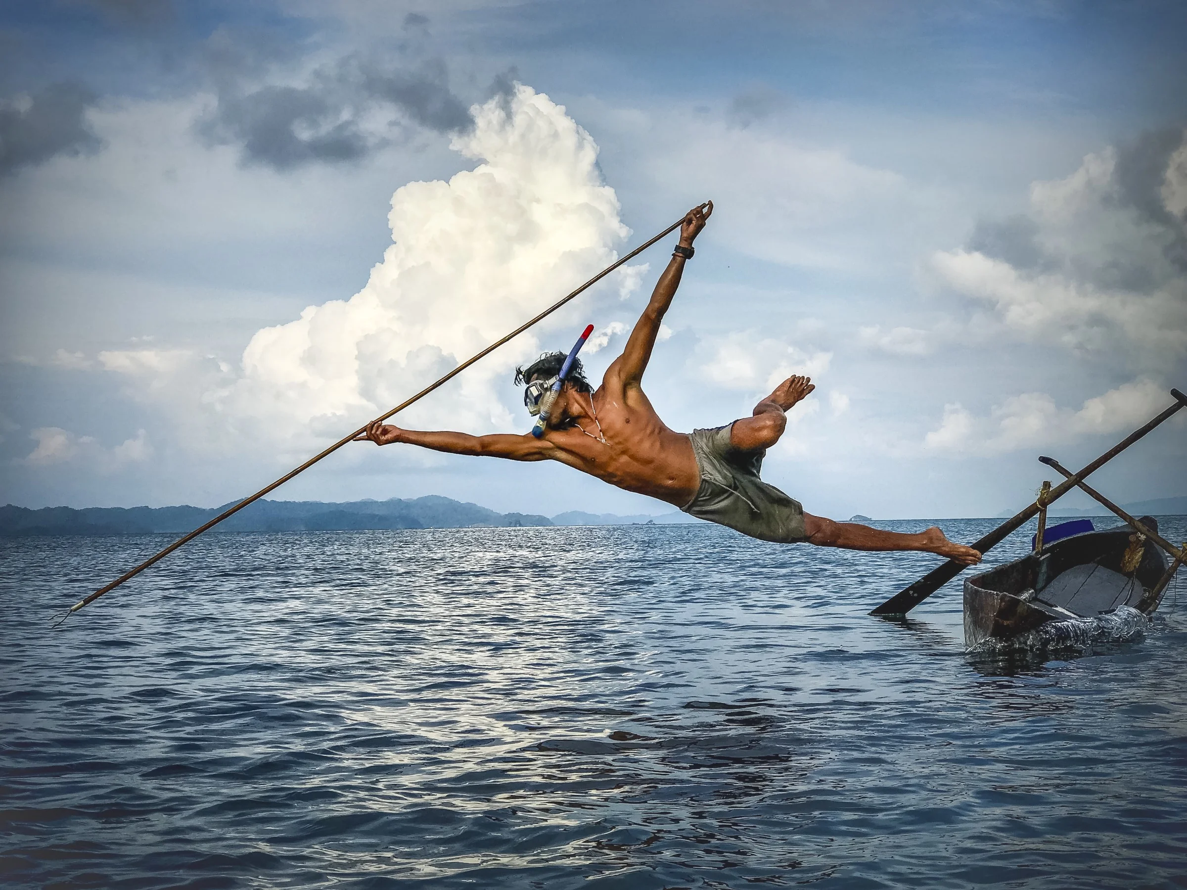 Clouds billow in the late afternoon sun and light glints on the sea. The diver’s long spear touches the water and a moment later he’s gone. Only an empty dugout canoe bobs in the water next to me. Standing in a small dinghy, I balance my weight to absorb the rocking, and wait for the freediving Moken fisherman to reappear.