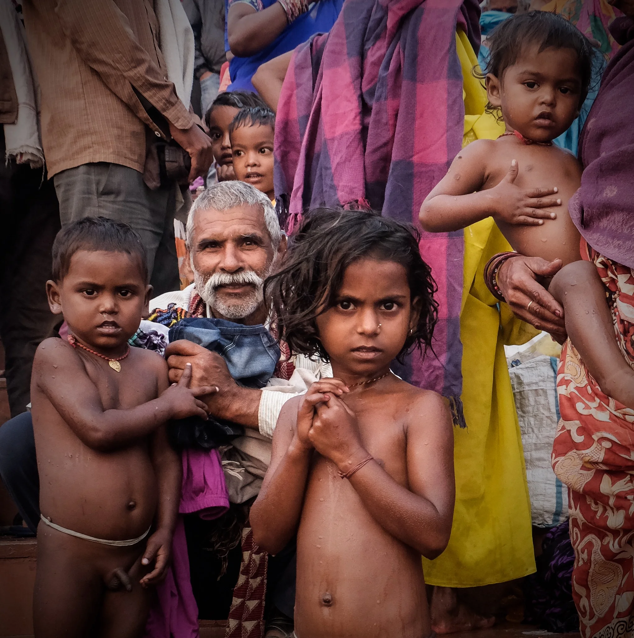I walk during the Mela with increasingly dense crowds towards the broad river, lined by cement ghats—the ever-present stepped platforms full of life along Indian waterways. A barber snaps his scissors overhead advertising his availability for a child's first ritual head shaving. This day many parents cannot reach the river for the density of the mob; so bald babies are trustingly passed above the crowd, assuring their dunking before the rising sun flashes on the water. Even in this intense swarm people save a smile for my visibly foreign face.