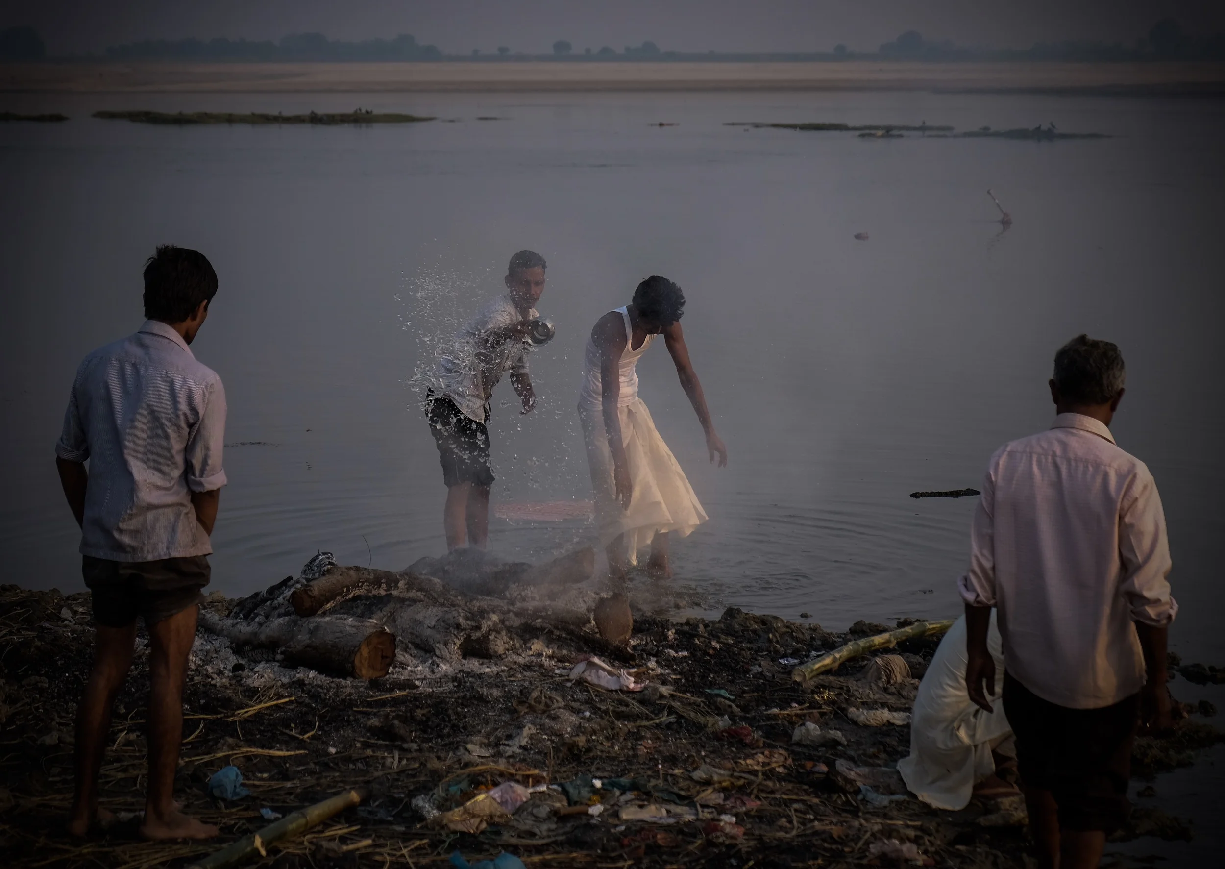 Smoke on a garbage-strewn rocky bank clears to show three sinewy men cremating a young family member. A brother reaches quickly into the fire to pull out remaining shards of bone and throw them in the river. Water is splashed onto the flames in the final step of the ritual.